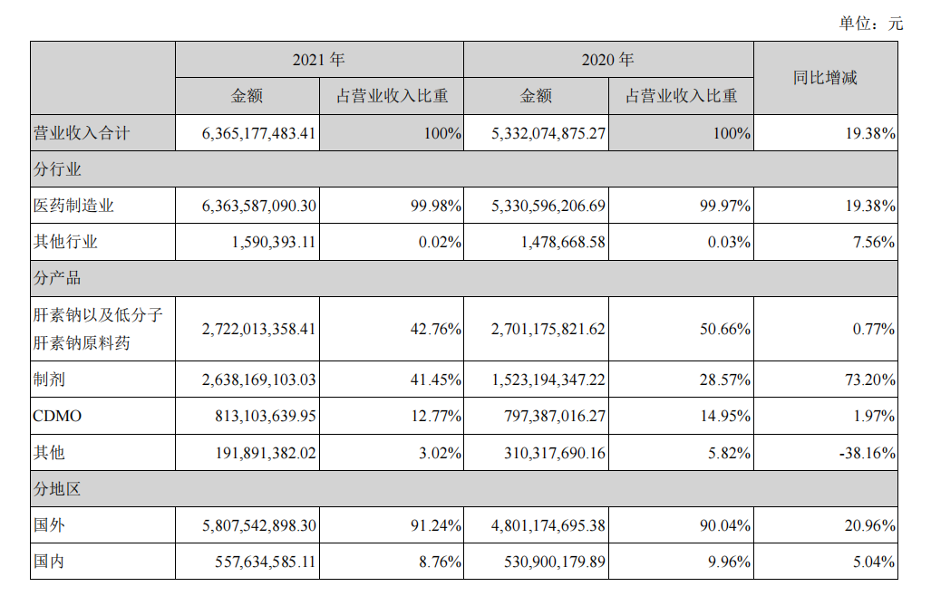 根據(jù)這樣的思路,筆者注意到一家肝素全球龍頭海普瑞(002399.SZ/9989.HK),其業(yè)務(wù)范圍涵蓋藥品生產(chǎn)及銷售、CDMO服務(wù)及創(chuàng)新藥開發(fā),近期也公布了2021年年報。海普瑞2021年實現(xiàn)收入63.65億元,同比增長19.38%。其中,制劑業(yè)務(wù)收入同比大增73.2%至26.38億元。那么,海普瑞的這份成績單究竟如何?